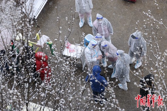 2022年3月18日,北京市一处因疫情被管控的小区内,医务人员在雪中为小区居民做核酸检测。中青报·中青网记者 曲俊燕/摄