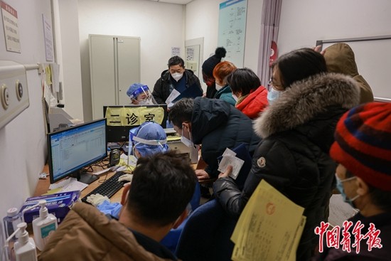 2022年12月27日,北京朝阳医院急诊科,患者及家属在诊室内排队就诊。两周内,首都医科大学附属北京朝阳医院急诊医学科持续高位运行,以老年人、合并基础病的危重症患者为主。中青报·中青网记者 曲俊燕/摄