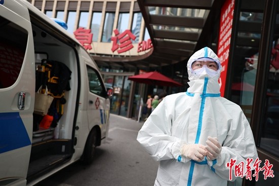 2022年4月28日,上海市虹口区,27岁的急救医生王晓惠在急诊室门外等待急救担架。她将一名昏迷的病人送至医院急诊室后,由于急诊室病人过多,没有空床位,救护车担架床在急诊室被占用。中青报·中青网记者 李强/摄