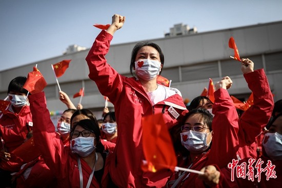 2020年4月9日,湖北省武汉市雷神山医院,最后一批援鄂医疗队集中撤离仪式上,年轻的医护人员挥舞国旗。中青报·中青网记者 赵迪/摄