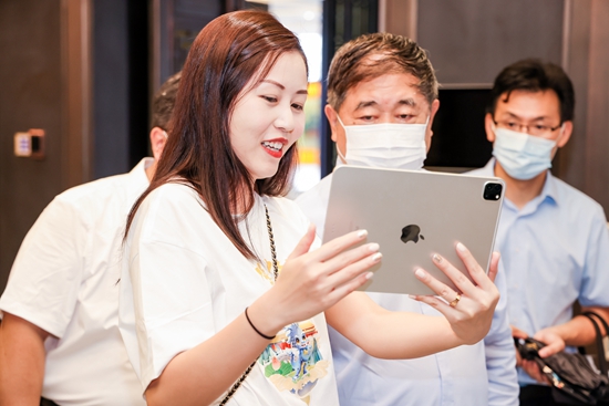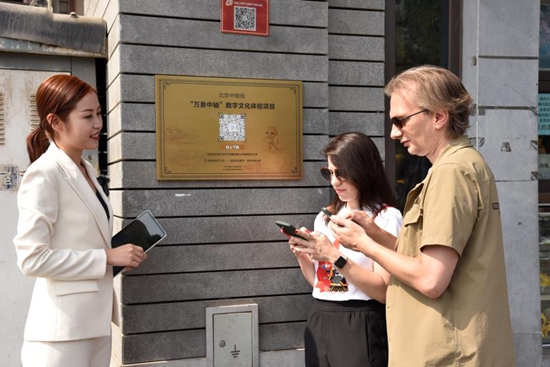 杨琬洁(左一)向嘉宾展示“灵图游”App的使用方法,在小神兽“水灵龙”的引导下,实地体验数字中轴探访线路。