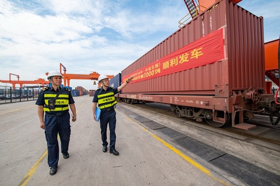 5月16日,浙江省金华市,满载100个标箱中国货物的中亚班列正在经海关工作人员监管,准备从中欧班列金东平台——铁路南站鸣笛启程,开往中亚五国。图片由视觉中国提供