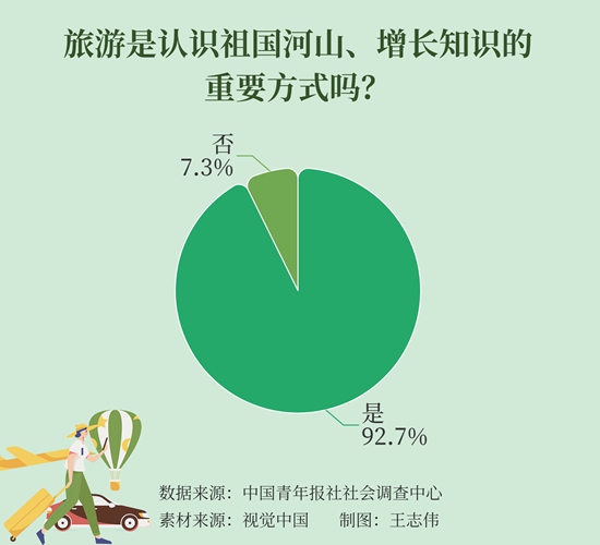 调查显示,92.7%的受访青年认为旅游是认识祖国河山、增长见识的重要方式。交互分析发现,85后受访者表示认同的比例更高,为95.7%,其次是00后,为93.2%。