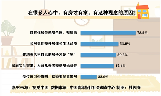 前不久,中国青年报社社会调查中心联合问卷网(wenjuan.com)进行的一项调查显示,78.5%的受访青年觉得自有住房能带来安全感、归属感,50.5%的受访青年认为在传统观念里,自己的房子才是“家”。47.4%的受访青年指出要求成家时有房是出于家庭实际需求,能够为育儿养老提供安稳条件。