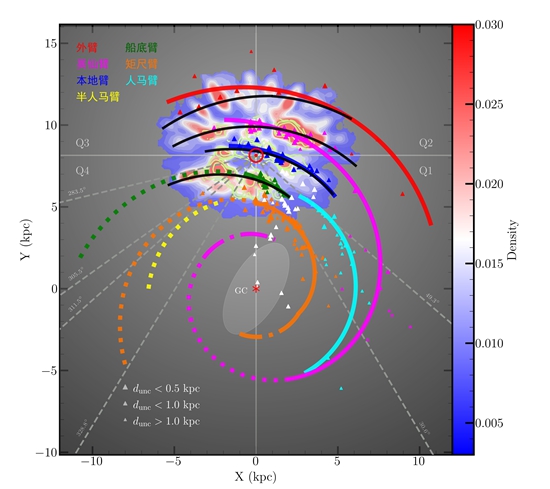 研究结果跟之前的认知截然不同。结果表明银河系具有多旋臂形态,其内部由英仙臂和矩尺臂两条旋臂对称向外延伸,在外部分叉并形成包括半人马臂、人马臂、船底臂和本地臂等多条长而不规则的旋臂段。