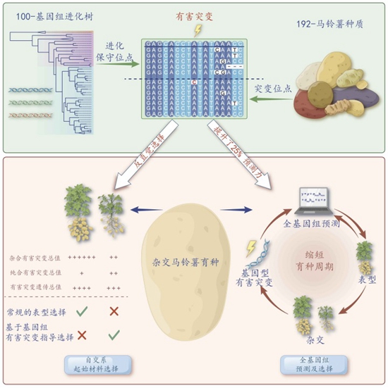 研究团队利用进化基因组学鉴定有害突变进而指导杂交马铃薯育种示意图。中国农业科学院深圳农业基因组研究所黄三文团队供图