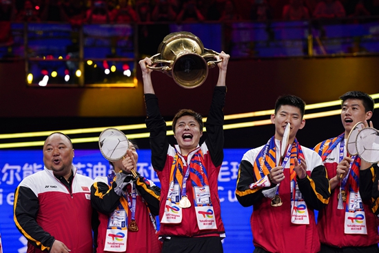 5月21日,中国队选手石宇奇(中)在颁奖仪式上举起苏迪曼杯。当日,2023年苏迪曼杯世界羽毛球混合团体锦标赛颁奖仪式在江苏省苏州市举行。中国队在决赛中以3比0战胜韩国队,夺得冠军。新华社记者 杜宇/摄