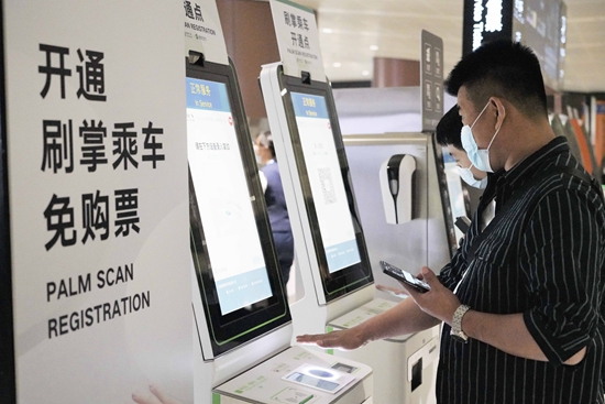 当日,北京轨道交通大兴机场线刷掌乘车服务正式上线。乘客通过注册开通刷掌乘车服务后,即可在该条地铁线路刷掌过闸乘车。王静颐/摄(新华社发)