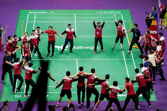 5月21日,江苏省苏州市,2023年苏迪曼杯世界羽毛球混合团体锦标赛决赛,中国队3∶0战胜韩国队后第13次夺冠,图为中国队赛后庆祝。视觉中国供图