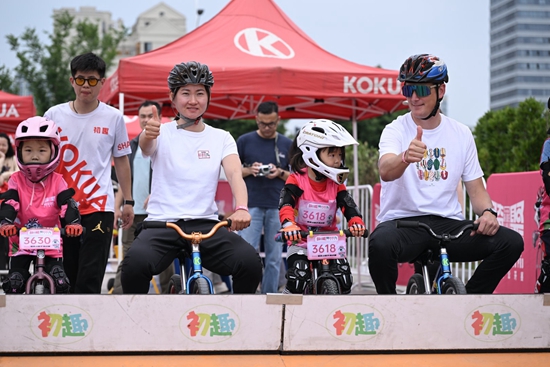 环意RIDE LIKE A PRO长三角公开赛中,奥运冠军钟天使(左三)参与儿童平衡车互动。组委会供图