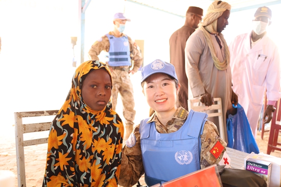 今年2月,我维和医疗分队赴加奥市兰德学校开展义诊活动,诊疗间隙,周娟受邀与当地女学生合影留念。刘宾/摄