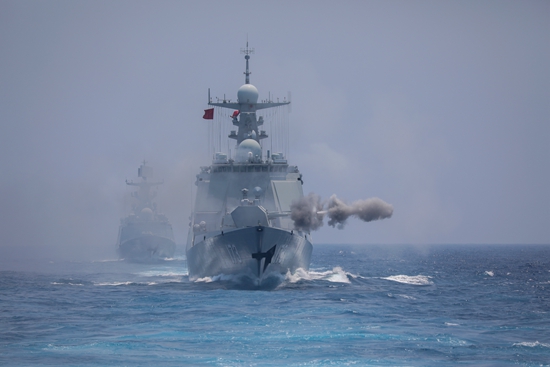 由大连舰、长沙舰、柳州舰和岳阳舰组成的舰艇训练编队实施对海突击。图为长沙舰、柳州舰主炮齐射。杨云翔/摄