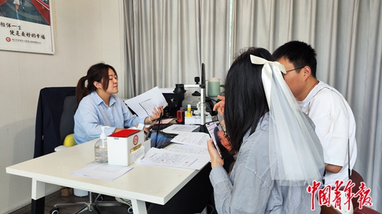 4月21日,四川成都。天府新区红梁湾公园婚姻登记处,工作人员正向新人介绍婚检一站式服务。中青报·中青网见习记者 王军利/摄