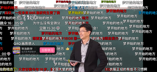 打开宋浩的高等数学教学视频,前来报到的同学们在弹幕集合,一起打出弹幕“梦开始的地方”,还会各自用所在大学名签到上课。等到课程结束时,大家会打出弹幕“完结撒花”“感谢宋老师”“全体起立,老师再见”——就算在线学习,也不能缺了线下课堂的仪式感。