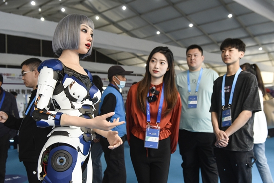 5月24日,机器人在峰会现场为观众讲解介绍。当日,以“机器智联、赋能万物”为主题的第八届中国机器人峰会暨智能经济人才峰会在浙江省余姚市开幕。