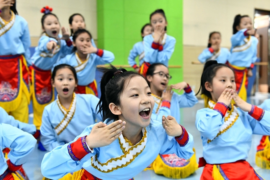 5月23日,山东省济南市历城二中闻韶艺术馆,同学们在练习舞蹈。该校通过开展国乐、舞蹈、合唱等项目,培养学生的兴趣特长和审美情趣,陶冶学生情操,提升学生的艺术修养。新华社记者 郭绪雷/摄