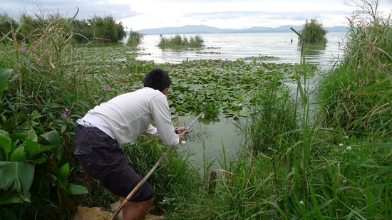 张乐嘉在滇池边上采集以及记录水环境。受访者供图
