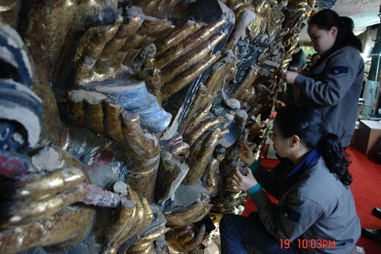 2011年10月19日,陈卉丽正在为千手观音造像进行渗透加固。本文图片均由受访者提供
