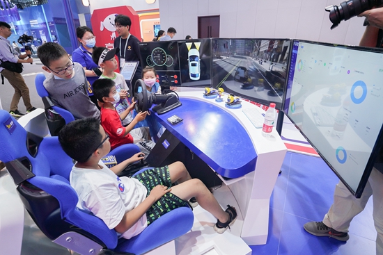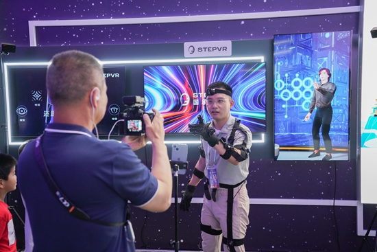 5月28日,北京,中关村论坛展示中心,媒体工作者在元宇宙展区与孩子们积极互动体验VR产品。视觉中国供图