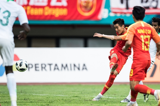 2018年雅加达亚运会,中国男足亚运队不敌沙特队止步16强。视觉中国供图(资料图)