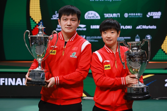 当地时间5月28日,分别获得世乒赛男女单打冠军的樊振东(左)、孙颖莎拍摄合影展示冠军奖杯。视觉中国供图