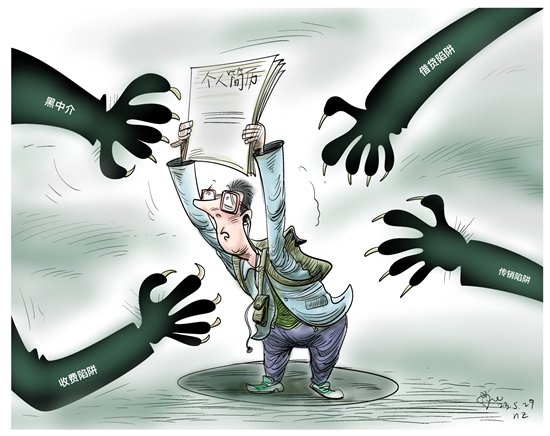 在高校毕业生即将走向职场之际,警方发布提示,提醒毕业生要小心“求职陷阱”,警惕套路和骗局。黑中介陷阱、收费陷阱、借贷陷阱、传销陷阱等,都可能使毕业生深受其害。(央视新闻 5月28日) 漫画:徐简