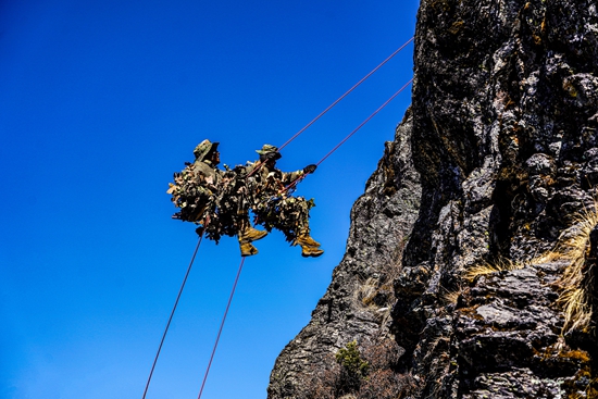 近日,在海拔4300米的喜马拉雅山脉腹地,西藏军区某合成旅依托高原复杂气候条件,组织侦察集训队开展穿插渗透、目标侦察、搜索警戒等多课目连贯考核,全方位锤炼侦察兵的技能水平,检验官兵在高海拔地区遂行侦察任务的能力。图为崖壁速降训练。邓智文/摄