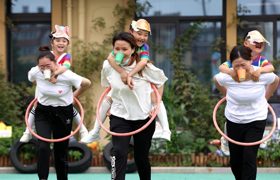 在安徽省合肥市长江东大街幼儿园举办的“萌娃迎六一”活动中,孩子和家长开心地参加各项趣味互动游戏。解琛/摄