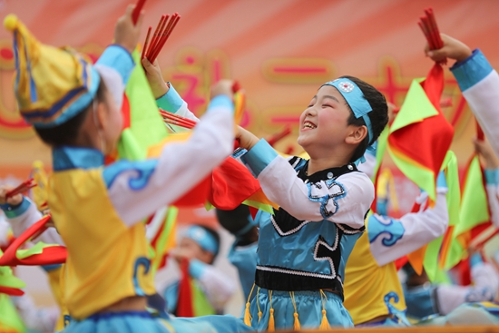 6月1日,孩子们在贵州省施秉县第二小学举行的庆“六一”活动中表演课桌手势舞。邰胜智/摄(新华社发)