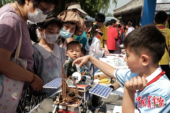 6月1日,北京北海公园,来自北京市朝阳区芳草地国际学校世纪小学四年级的少先队员王逸帆(右一)正在展示作品“月饼号”月球车。中青报·中青网记者 张玉佳/摄