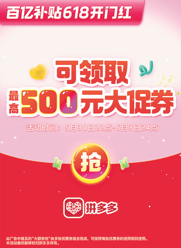百亿补贴618开门红 可领取最高500元大促券