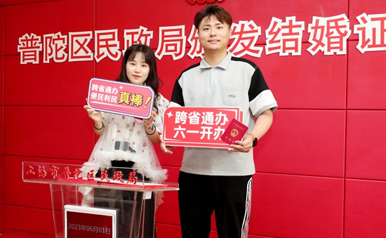 6月1日,来自陕西的刘先生和姚女士在上海市普陀区婚姻收养登记中心完成婚姻登记“跨省通办”。