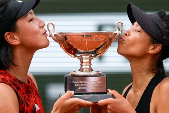 北京时间6月11日晚,法国巴黎,海峡组合王欣瑜(左)/谢淑薇捧起2023法网女双冠军奖杯。视觉中国供图