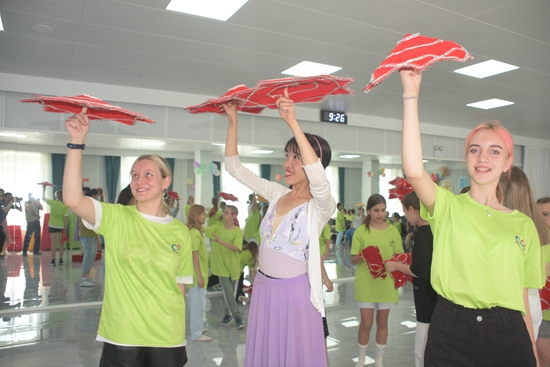 6月13日,黑龙江黑河,俄罗斯布拉戈维申斯克市斯沃伊学校的青少年在中俄青少年活动中心学习中国传统手绢舞。
