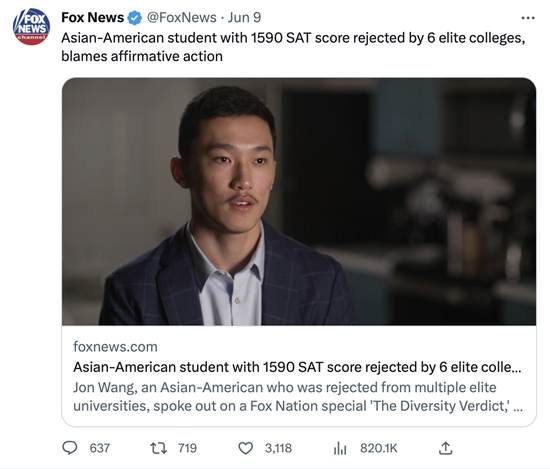 2021年年底,美国佛罗里达州18岁的亚裔学生乔恩·王,将美国哈佛大学和北卡罗来纳大学告上了联邦最高法院,起诉内容为这两所学校在本科录取申请者时存在歧视亚裔行为。