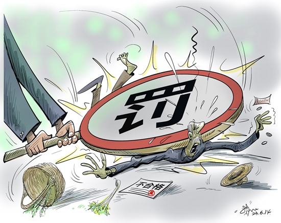 福建福州一名老农,因销售不合格芹菜获利14元,收到5万元罚单,还因未及时缴纳罚款,被追加了5万元罚款。这一争议案件最后经由法院裁定,认为处罚畸重,不准予强制执行。事实证明,人性化的执法更容易让人口服心服,也更容易让人感受法治的价值。(北京日报客户端6月14日) 漫画:徐简
