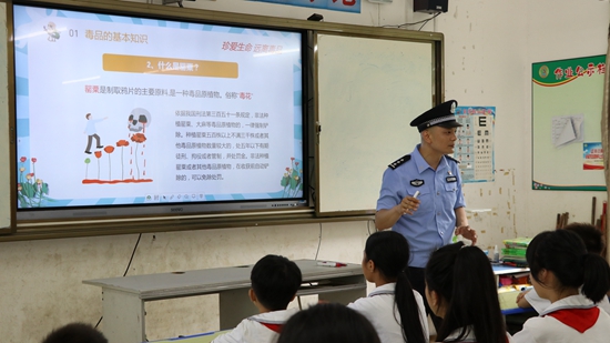 “同学们,看到有人种植毒品如何处理?”“这个看起来是跳跳糖,其实是毒品!”6月15日上午10点,在距离中越边境直线不到一公里的凭祥市国门雷锋学校——卡凤小学,宋伦在为六年级的学生上一堂远离毒品的普法教育课。从什么是毒品到如何拒绝毒品,再到涉毒品相关的罪名和典型案例,宋伦作了详细的讲解和案例警示教育。