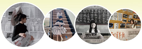 拍摄时,学前教育专业女生艾丽菲热·西尔艾力想到了巴黎时装周的模特,她和舍友阿迪兰·买买托合提用旧报纸制作了项链、带有流苏的连衣裙和蝴蝶结头饰,在《中国青年报》背板的衬托下,富有青春时尚的视觉冲击力。
