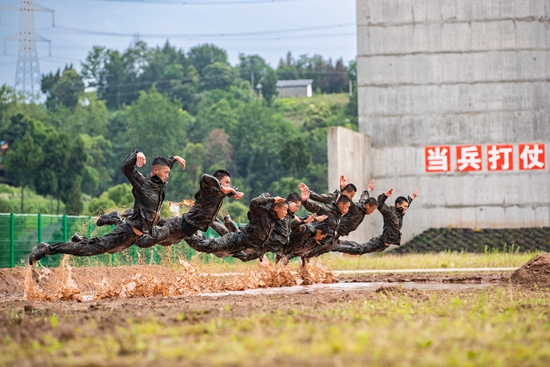 日前,武警重庆总队执勤第三支队将机动分队拉到陌生地域,展开为期一个月的高强度、超负荷野外驻训,充分利用野外山地环境,锤炼官兵一招制敌的本领。图为武警官兵在泥潭中开展训练。邹毅/摄