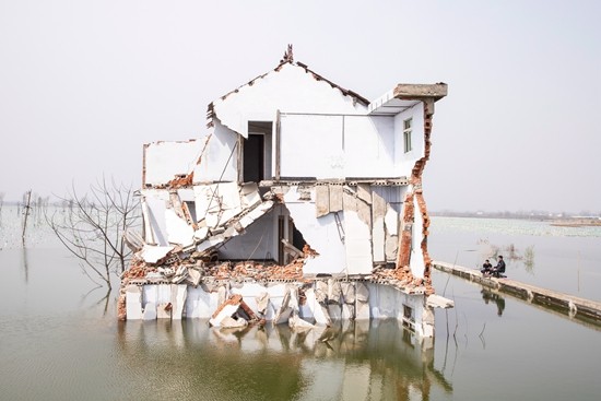 作者拍摄了家乡安徽省阜阳市颍上县江口镇夏圩村采煤塌陷区的景观。这里是当地一处煤矿的首采塌陷区,大约10年前开始塌陷,植被、房屋、土地被地下水淹没。10年后,村民搬迁后留下的空房屋仍在不断扩大的水域中沉陷,村民时不时会回到这里散步、钓鱼,回忆曾经在此生活的点滴。