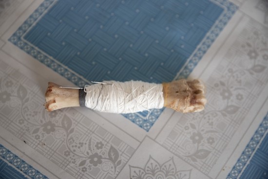 2022年10月19日,黑龙江省哈尔滨市呼兰区孟家乡小和平屯,一个村民家的火炕上,一个自制的羊骨老式线轴。在东北农村,用不同动物的骨头制成的线轴十分常见。