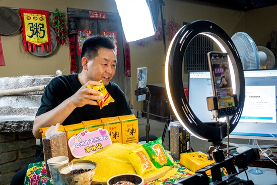 7月2日,河南滑县,在焦虎镇屯集村,滑县政协委员、新联会副会长、网联会副会长朱如海利用新媒体掌上滑州帮助春芽种植农民专业合作社通过网络直播销售农产品。视觉中国供图