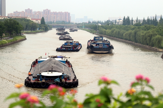 7月2日,货物运输船只行驶在京杭大运河江苏苏州段。视觉中国供图