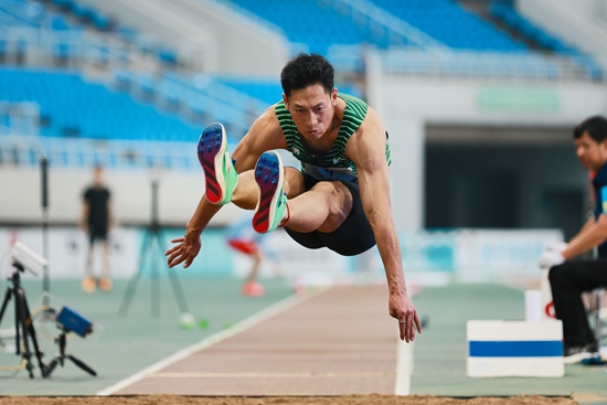 近日,在全国田径冠军赛暨世锦赛及亚运会选拔赛中,石雨豪以8米18获男子跳远亚军。视觉中国供图
