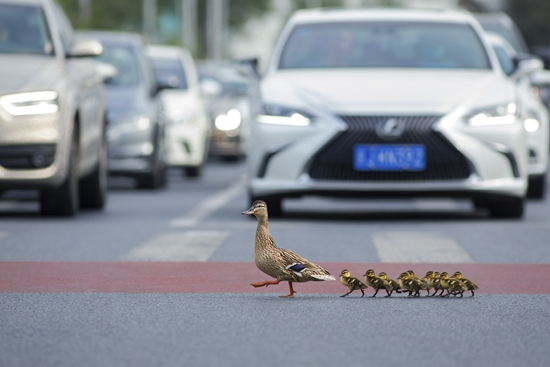 2020年6月,北京,鸭妈妈带孩子过马路。张瑜/摄