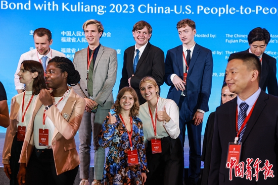 6月28日,福建福州,2023“鼓岭缘”中美民间友好论坛现场,参会的留学生代表合影留念。中青报·中青网记者 曲俊燕/摄