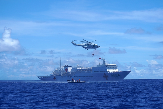 当地时间7月6日上午,中国海军“和平方舟”号医院船在西太平洋某海域开展全要素、全流程海空立体医疗救护演练。