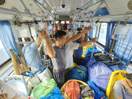 7月5日,在江西南昌县179路公交车内,20余名菜农带着他们的菜准备进城卖菜。