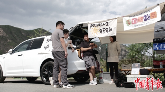 在北京市门头沟的一段盘山公路休息区,褚梦楠停好车子,支起帐篷,打开后备箱,将盛满冰粉的保温桶摆在帐篷下的长桌上,再将咖啡机插上户外电源,码好剩余的物料,抬手把招牌挂在帐篷沿,叫卖起冰粉和咖啡。