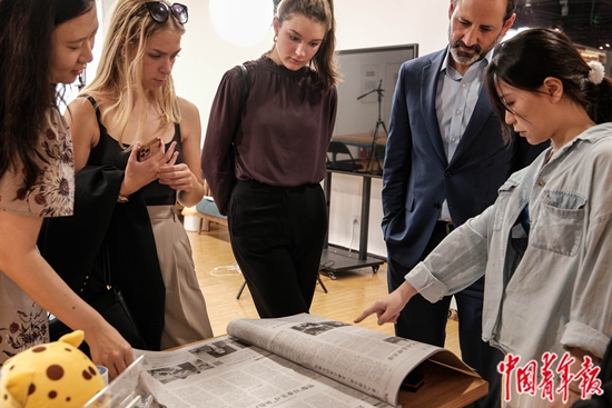 6月21日下午,北京前门青年书店,中国青年报记者(右一)正在为美国大学生介绍《中国青年报》的版面文章。本版图片均由中青报·中青网记者 张玉佳/摄